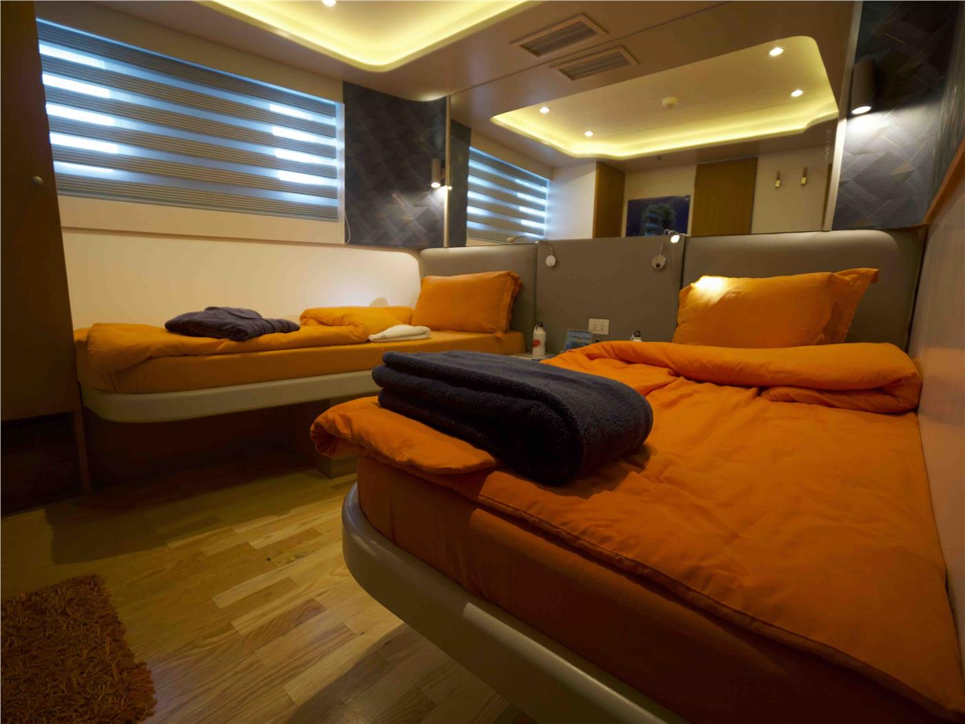 Les cabines doubles situées sur le pont inférieur disposent de deux lits simples et offrent un confort idéal pour les amis ou les compagnons de voyage qui souhaitent dormir séparément. Elles sont équipées d'une salle de bain privée, de la climatisation et d'un espace de rangement suffisant.