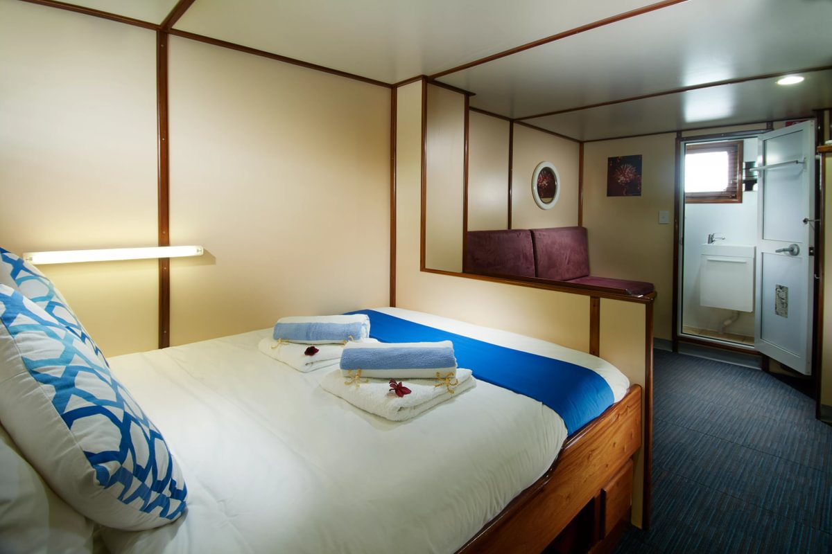 Ces cabines Standard à lits jumeaux sont situées sur le pont inférieur du bateau et offrent un hébergement confortable pour deux hôtes avec une salle de bain commune sur le pont de plongée.
