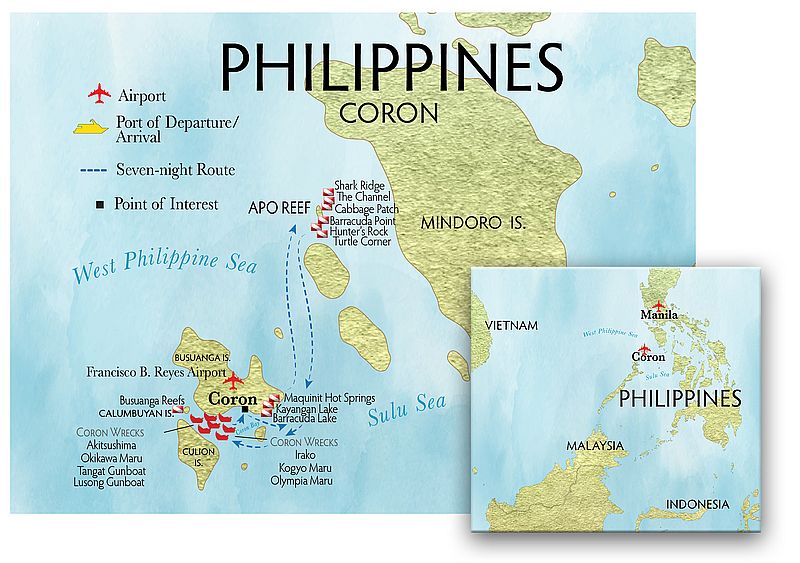 This extended itinerary combines the Philippines’ most iconic wreck and reef diving regions. In Coron, divers explore legendary World War II shipwrecks, historically fascinating sites now transformed into thriving artificial reefs. This itinerary also includes diving at Apo Reef Natural Park, the largest coral reef in the Philippines, located in Occidental Mindoro, which is also the world's second-largest contiguous coral reef system after Australia's Great Barrier Reef. This protected area features two large atoll-like reefs, a deep channel, and is a biodiversity hotspot with abundant corals and marine life, making it a premier dive destination and a potential UNESCO World Heritage Site.